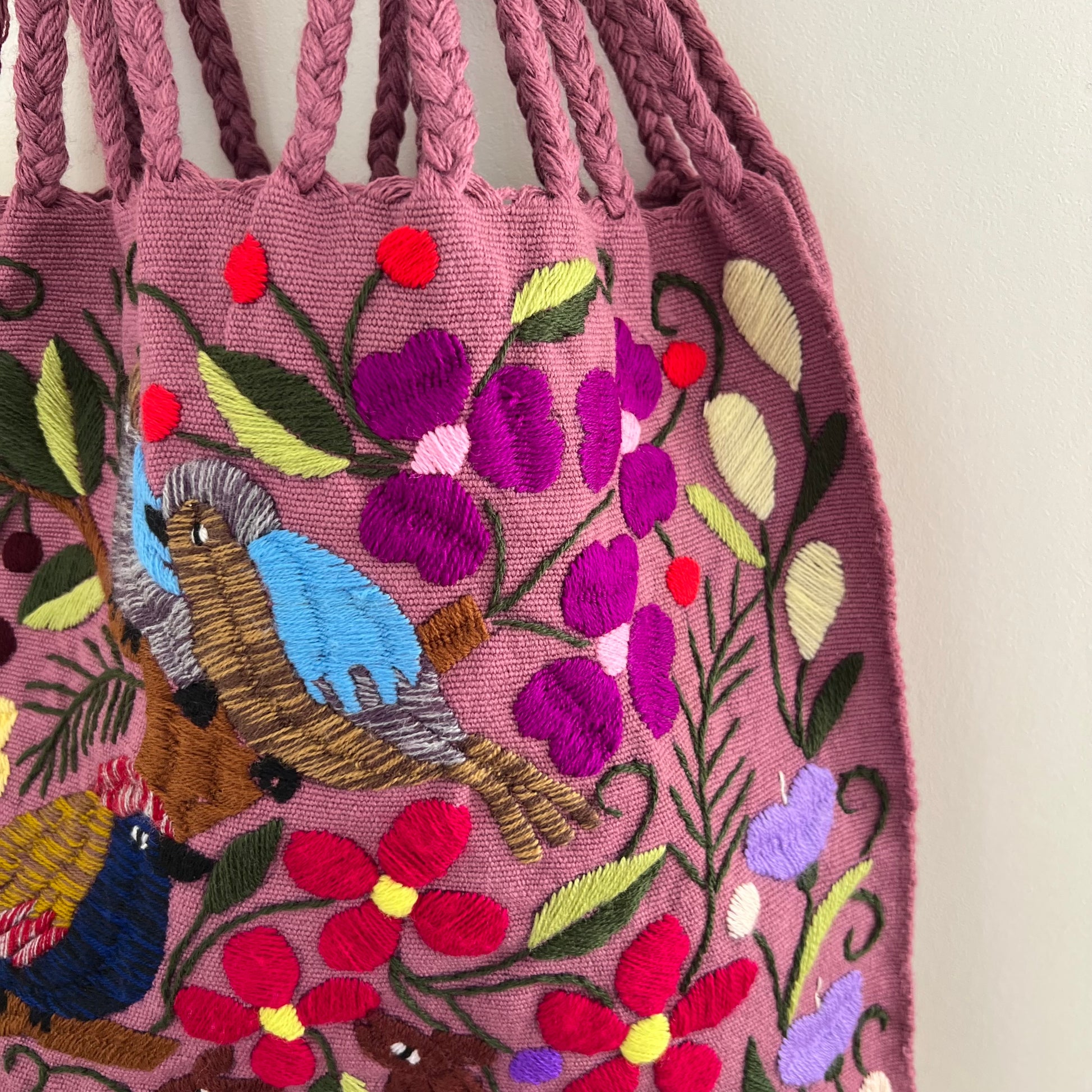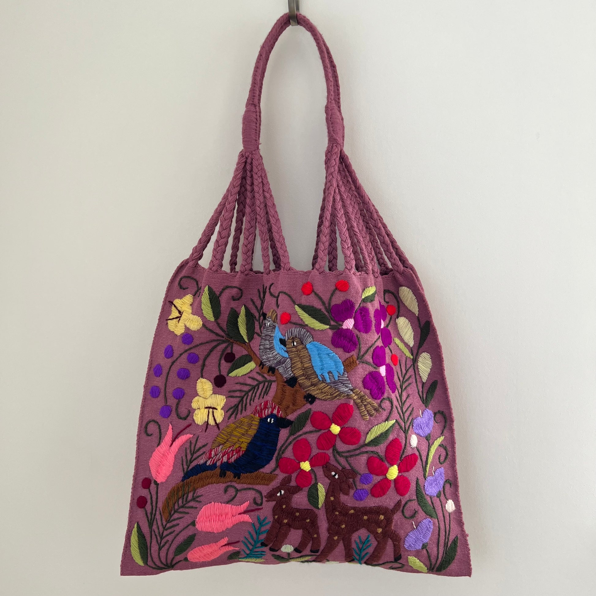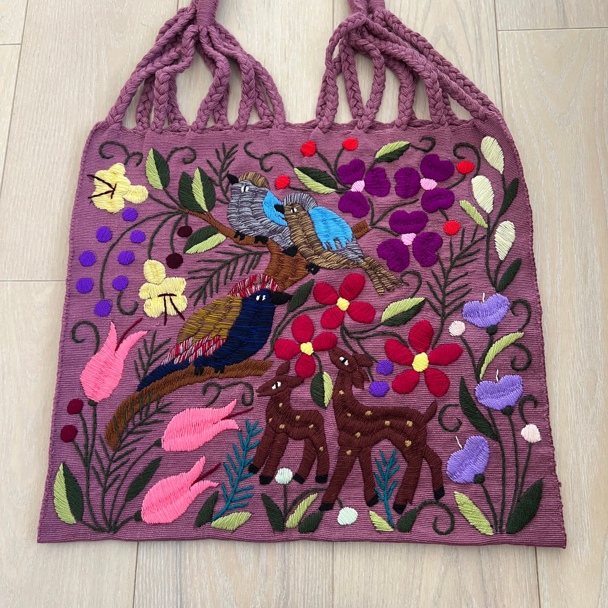 片面にアクリル毛糸で植物と動物たちの手刺繍がされています。