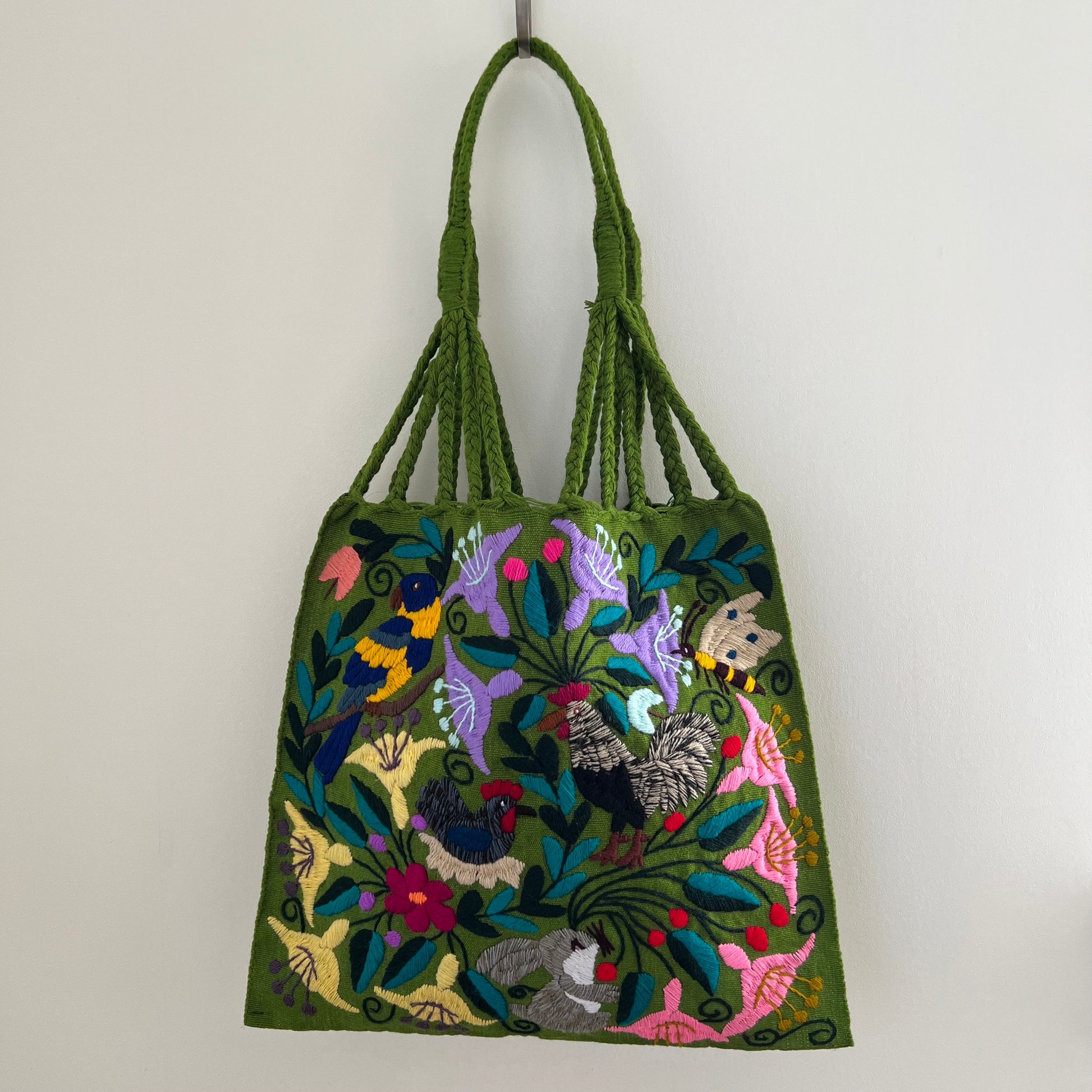 片面にアクリル毛糸で植物と動物たちの手刺繍がされています。