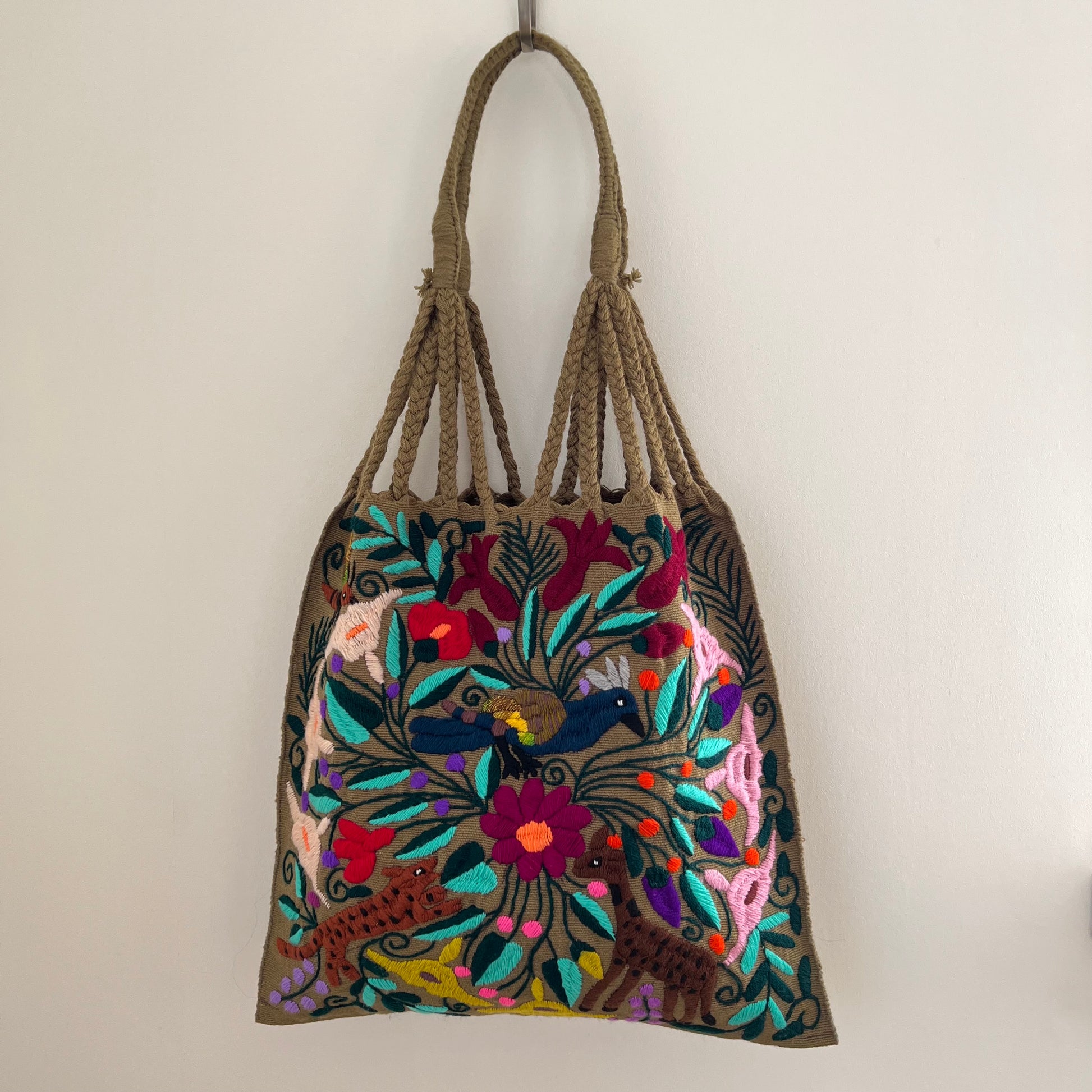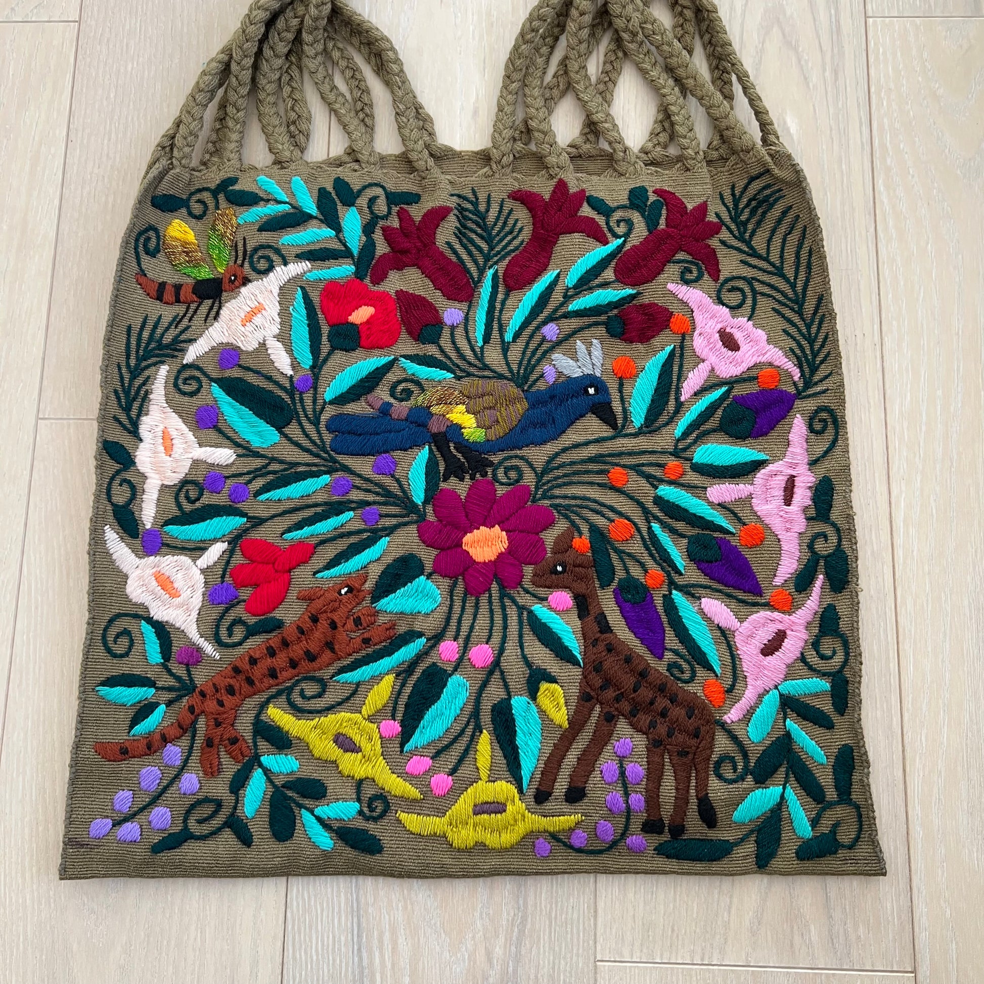 片面にアクリル毛糸で植物と動物たちの手刺繍がされています。