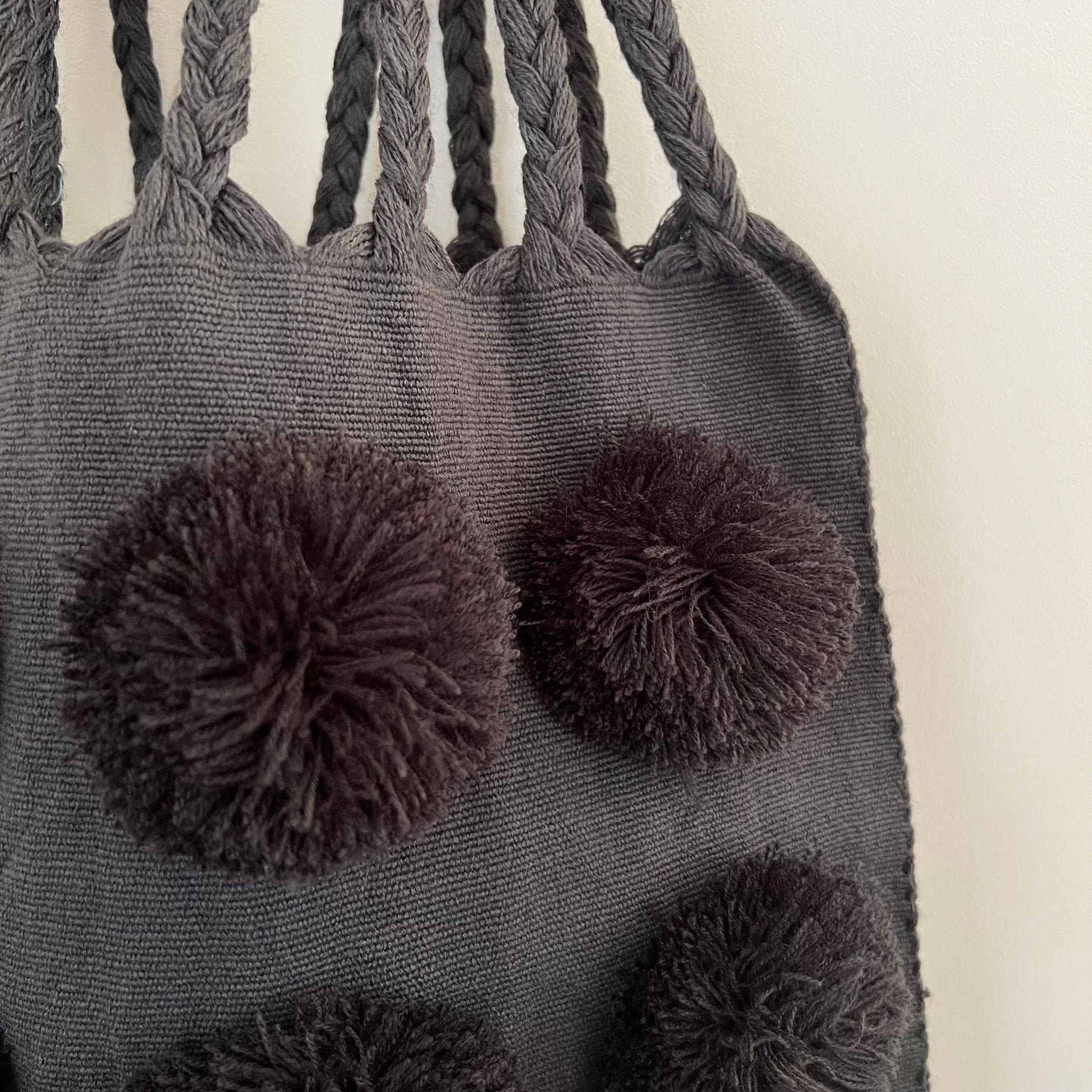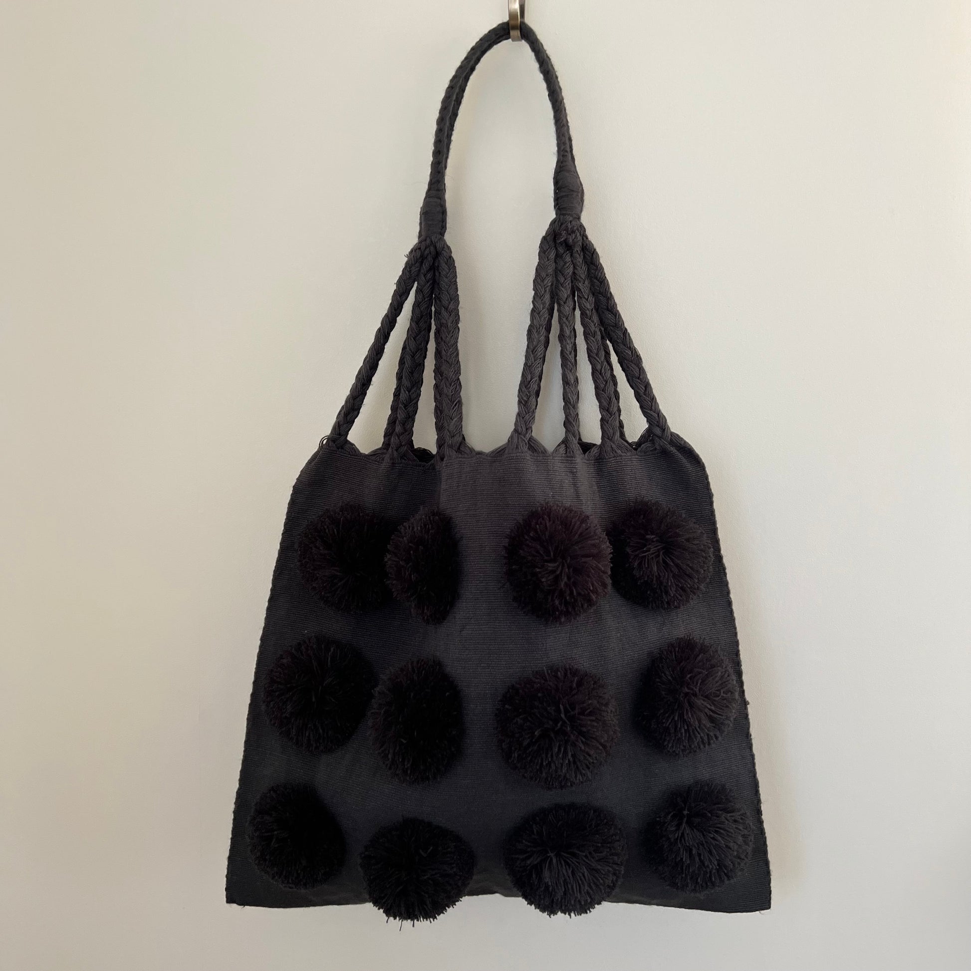 丈夫なポリエステル糸で織り上げたバッグにアクリル毛糸でできたポンポンが